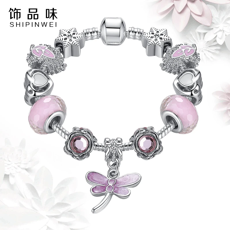 Main Features : Lovely Candy Pink Murano Glasss Bead Fit Women Bracelet &Bangle Crystal Dragonfly Charm Bracelet For Women Girl Christmas Gift